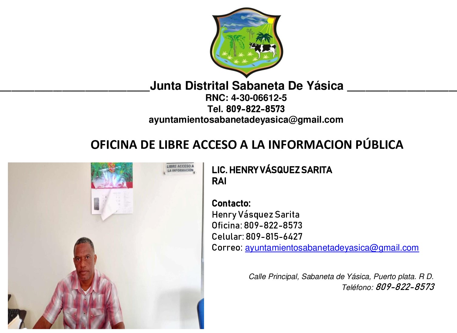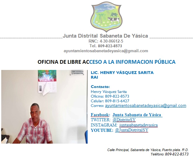 Licenciado Henry Vásquez Sarita [email protected] juntasabanetadeyasica.gob.do Tel. 809-815-6427/809-822-8573 facebook: Junta Distrital Sabaneta de Yásica CONTACTO OFICINA RAI SY Descargar 370.15KB Fecha de subida: 6 diciembre, 2024 Descargar 84.73KB Fecha de subida: 7 mayo, 2024 RESPONSABLE LIBRE ACCESO RAI Descargar 69.82KB Fecha de subida: 26 enero, 2024 CONTACTO RAI Descargar 190.81KB Fecha de subida: 26 enero, 2024
